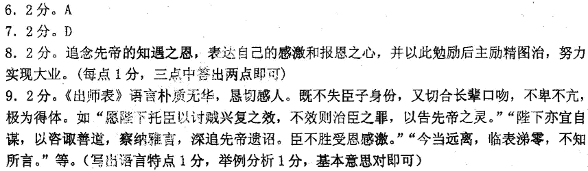 9.“出师一表真名世,千载谁堪伯仲间”是南宋诗人陆游对本文的评价。请结合选文,从语言的角度,举例谈谈你对这句诗的理解。(2分)