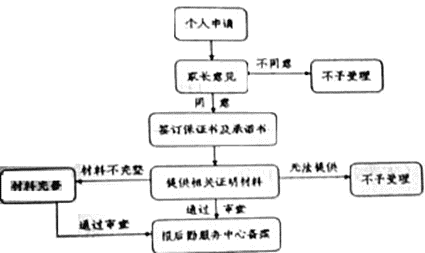 解析:本题考查图文转换的能力。重点考查流程图。答题时,注意题目要求,看清楚流程图陈述的对象;看清箭头指向或事物的发展方向;然后把握各步骤之间的关系,条件、因果或转折等。根据大箭头的方向,此过程主要有几大步,然后分别又有几个环节,表述时要信息完整,语言通顺。表述时先明确话题学生申请校外租房,按图表述,首先先个人提出申请,然后需家长同意,家长不同意,不予受理;然后签订保证书和承诺书;还要提供相关证明材料,如果无法提供不予受理,材料不全需完善;最后,通过审查后,报后勤服务中心备案。