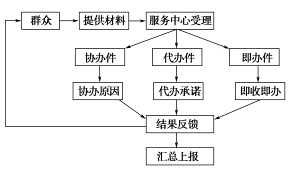 9、下面是某服务中心为方便群众办事而提供的流程图,请把这个图转写成一段文字介绍,要求内容完整,表述准确,语言连贯,不超过90个字。