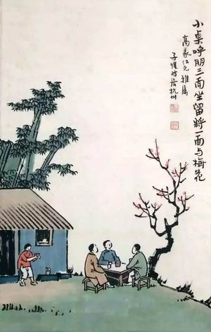 17.①漫画内容:小木屋前,修竹俊秀,屋前开阔平坦,三两好友,环几而坐,饮酒品茗,独留一面相邀梅花。