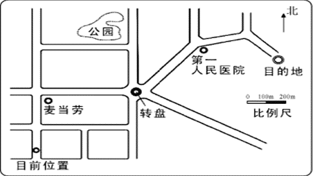 5.参考:①北向直行至麦当劳右转,②行至转盘沿东北方向经第一人民医院折向东偏北方向,③行驶约200米后转向东南方,④约200米即到。(4分,一处表述不清扣1分,超字数扣1分。)