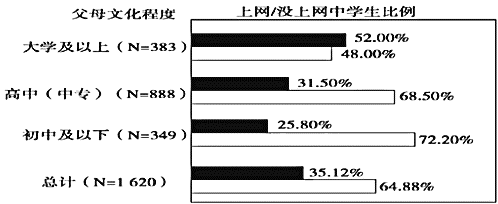 20.调查说明,上网的中小学生仍然比没上网的少;父母文化程度越高,其子女使用网络的比例越高,其差异显著。