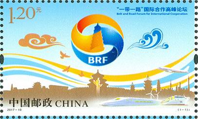 (1)画面由两个交汇的环形箭头、英文字母BRF(“一带一路”国际合作高峰论坛的英文缩写)、祥云和水纹元素构成。(2)邮票的整体图案设计体现了中国愿与“一带一路”沿线国家一道,携手共建“一带一路”,实现和平、发展与繁荣的愿景。