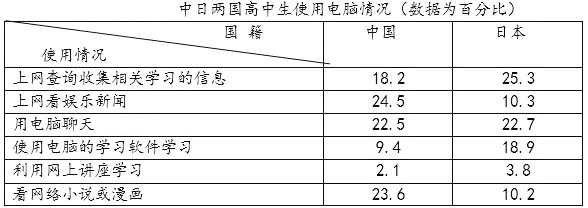 (1)与日本高中生相比,我国高中生电脑使用呈现出怎样的特点?请简要概括。(不得出现具体数字)(2分)