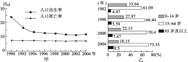 17.阅读某省“人口出生率、死亡率变化图”(甲图)和“人口年龄结构变化图”(乙图),完成后面的问题。(6分)