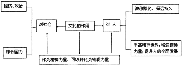 试题分析:本题主要考查语言表达的能力。这是一道图表说明的题目,属于图文转换类的题目。此类试题解答时,图表说明的题目,重点关注图标的表头和所问问题,此题根据题干可知是“关于文化作用的框架图”,答题时注意搞清图表的要素之间的关系。注意“文化的作用”“文化作为精神力量,可以转化为物质力量”“对社会”“对人”等要素,用概括性的语言来表述,要求内容完整,表述准确,语言连贯。