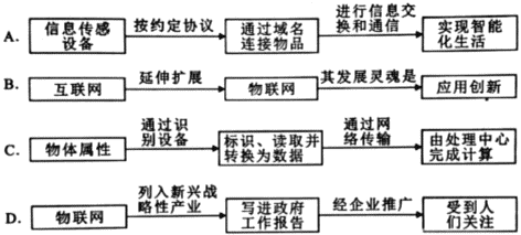 C(由材料一第二段可知,物联网的开展首先是标识物体属性,然后通过识别设备读取物体属性,并将信息转换为数据格式,识别设备并不标识物体属性。)