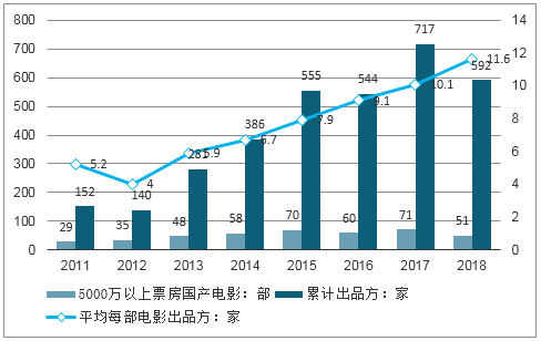 C.2011~2017年(除2012、2016外),国产电影累计出品方的数量整体呈增长趋势,而平均每部电影出品方的变化态势与此大体同步。