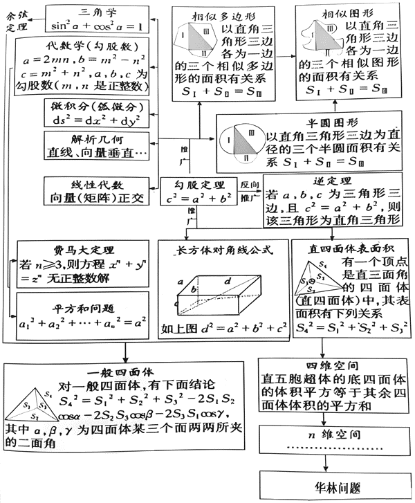 最近在寻找“以直角三角形三边各为一边的三个相似多边形的面积关系”和“以直角三角形三边各为一边的三个相似图形的面积关系”,终于找到了一张勾股定理推广形式表。