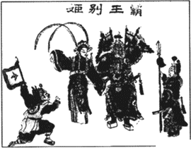 22.这是根据戏曲《霸王别姬》创作的戏出年画、画面淡化背景,仅借两侧士兵交待故事发生的背景,突出人物表情、动作的刻画,项羽眼望虞姬执其手显示不舍,虞姬高扬右手暗示离别。(6分,“戏出画”1分;“淡化背景”1分,“交待故事背景”1分;“突出人物表情、动作的刻画”1分,画面描述2分,意思对即可)
