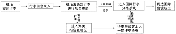 21.【答案】在蓝天机场托运行李出境时,旅客先在机场交运行李,机场录入行李信息。机场海关再对行李进行后台查验,无需开箱行李进入国际行李分拣系统,最后到达国际出境航班;需开箱行李,则进入海关指定查验区,旅客本人需同行李一同接受检查,检查通过行李进入国际行李分拣系统,最后到达国际出境航班。