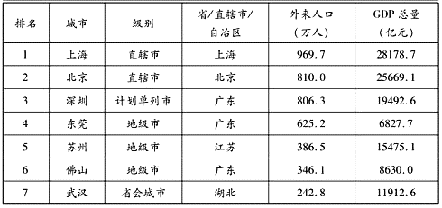 B.根据材料二的图表,我们可以看出,一般来说外来人口数量更多的城市,GDP总量排名也更高,但也有例外。
