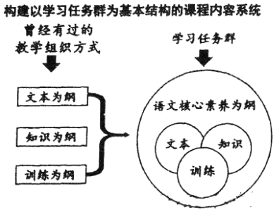 21.关于高中语文的课程内容系统,以前的教学组织方式主要以文本、知识、训练为纲,三者支离;而现在则是学习任务群的组织方式,以语文核心素养为纲,文本、知识、训练三者互相交融,多元共生。