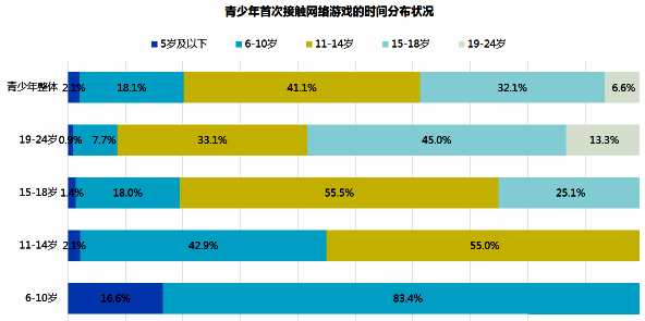 C.从我国青少年首次接触网络游戏的时间分布状况图来看,青少年整体14岁以下就开始玩网络游戏的占比重较大,高达41.1%。