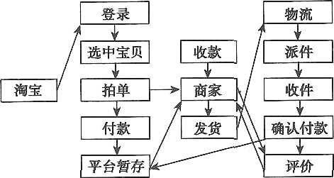 21.买家登录淘宝网页,选中所要购买的宝贝,拍单给商家,同时付款给支付平台暂存。商家接单发货,物流运送派件,买家收货后确认付款,平台付款给商家,买家对这次购物进行评价,商家对评价作出回应。